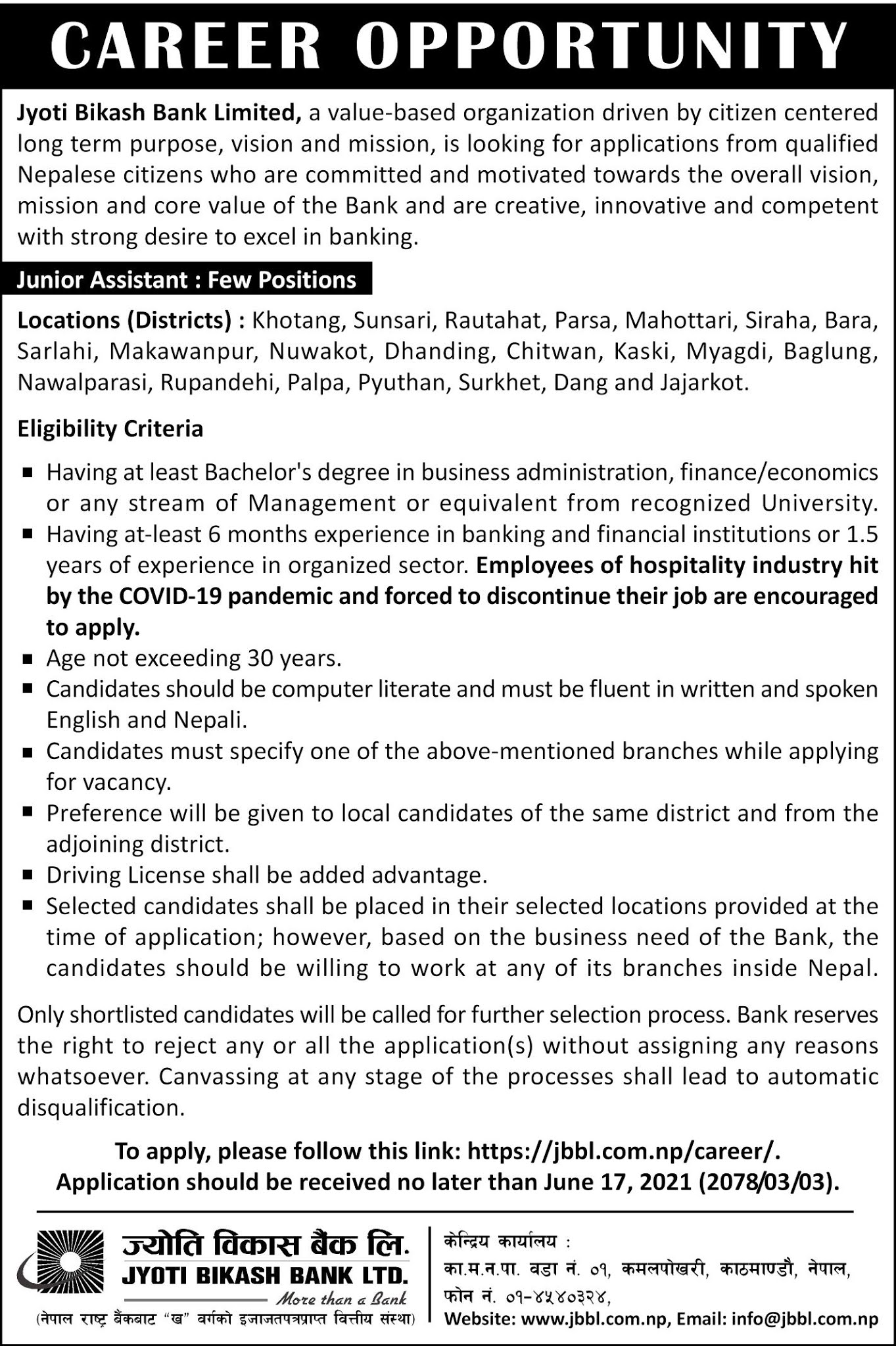 बिहिबार बैंकले खोटाङ्ग, सुनसरी, रौतहट, पर्शा, महोत्तरी, शिराहा, बारा, शर्लाही, मकवानपुर, नुवाकोट, धादिङ, चितवन, कास्की, म्याग्दी, बाग्लुङ्ग, नवलपरासी, रुपन्देही, पाल्पा, प्यूठान, शुर्खेत, दाङ्ग र जाजरकोट जिल्लाका लागी जुनियर असिस्टेन्ट पदमा कर्मचारी माग गरेको हो ।