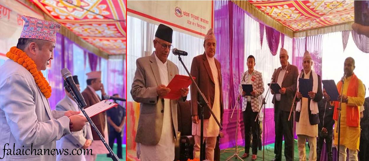 नवनियुक्त मुख्यमन्त्री तथा मन्त्रीहरुलाई प्रदेश १ प्रदेश प्रमुख सोमनाथ अधिकारी प्यासीले सपथ ग्रहण गराए । मुख्यमन्त्री राईले नवनियुक्त राज्यमन्त्रीलाई पद तथा गोपनीयताको सपथ ग्रहण गराएका छन् । नवनियुक्त मुख्य मन्त्री, मन्त्री तथा राज्यमन्त्रीले हिजै पदभार ग्रहण गरेका छन् ।