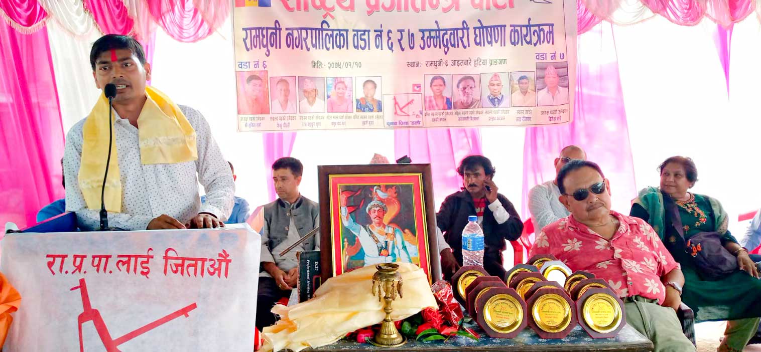 बक्लौरी । राष्ट्रिय प्रजातन्त्र पार्टिले सुनसरीको रामधुनी नगरपालिका वडा नं ६ र ७ मा उमेदवार घोषणा गरेको छ ।