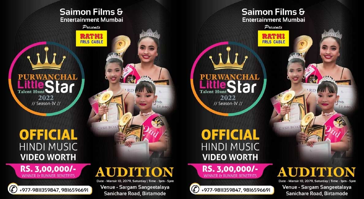 रामधुनी । विगतमा सफल रुपमा संचालन भएको बालबालिकाको सौन्दर्यता र क्षमता प्रष्फुटनमा आधारित सौन्दर्य प्रतियोगिता ‘पुर्वान्चल लिटिल स्टार’ को चौथो संस्करण हुने भएको छ । साईमन फिल्मस एन्ड इन्टरटेन्मेन्ट मुम्बईको प्रस्तुति तथा ओजस फिल्म्स प्रालीको आयोजनामा हुने यो प्रतियोगितालाई राठी केबलले मुख्य प्रायोजन गर्ने भएको छ । यो प्रतियोगिताको पहिलो अडिसन आगामी मंसिरको १० गते शनिबार हुने भएको छ ।