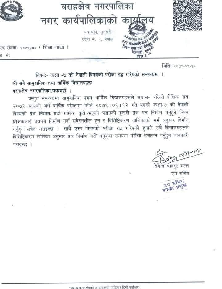 नगरपालिकाले एक सूचना जारी गर्दै १२ गते सञ्चालन भएको कक्षा ७ को नेपाली विषयको प्रश्नपत्र निर्माण गर्दा गम्भीर त्रुटि भएको पाइएको भन्दै सबै सामुदायिक तथा धार्मिक विद्यालयहरूको परीक्षा रद्द गरिएको शिक्षा विभागका उपसचिव देवेन्द्रबहादुर मल्लले जानकारी दिए ।