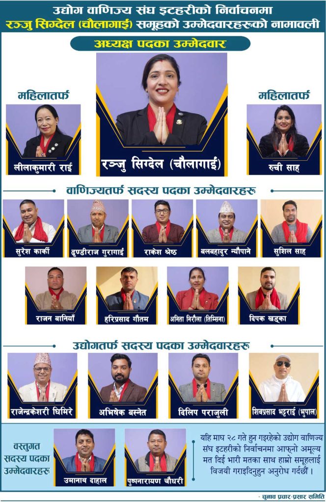 अतः व्यवसायीहरूका समस्यालाई समाधान गर्ने कुशल नेतृत्व र सबै व्यवसायीहरूलाई समेटेर आवाज उठाउन सक्ने टिम आजको टड्कारो आवश्यकता हो । त्यसैले सफल व्यवसायी, जुझारु युवा तथा विभिन्न सङ्घ संस्थाहरूको नेतृत्व गरी खारिनुभएकी उद्योग वाणिज्य सङ्घ इटहरीको कार्यसमितिमा समेत रहेर महिला उद्योगी, व्यवसायीहरूका माझ तालिमलगायत विभिन्न माध्यमबाट स्थापित युवा नेतृ रञ्जु सिग्देल(चौलागाईँ)को नेतृत्वमा समावेशी समूहसहित निम्न प्रतिबद्धताका साथ उम्मेदवारी दिएका छौँ ।