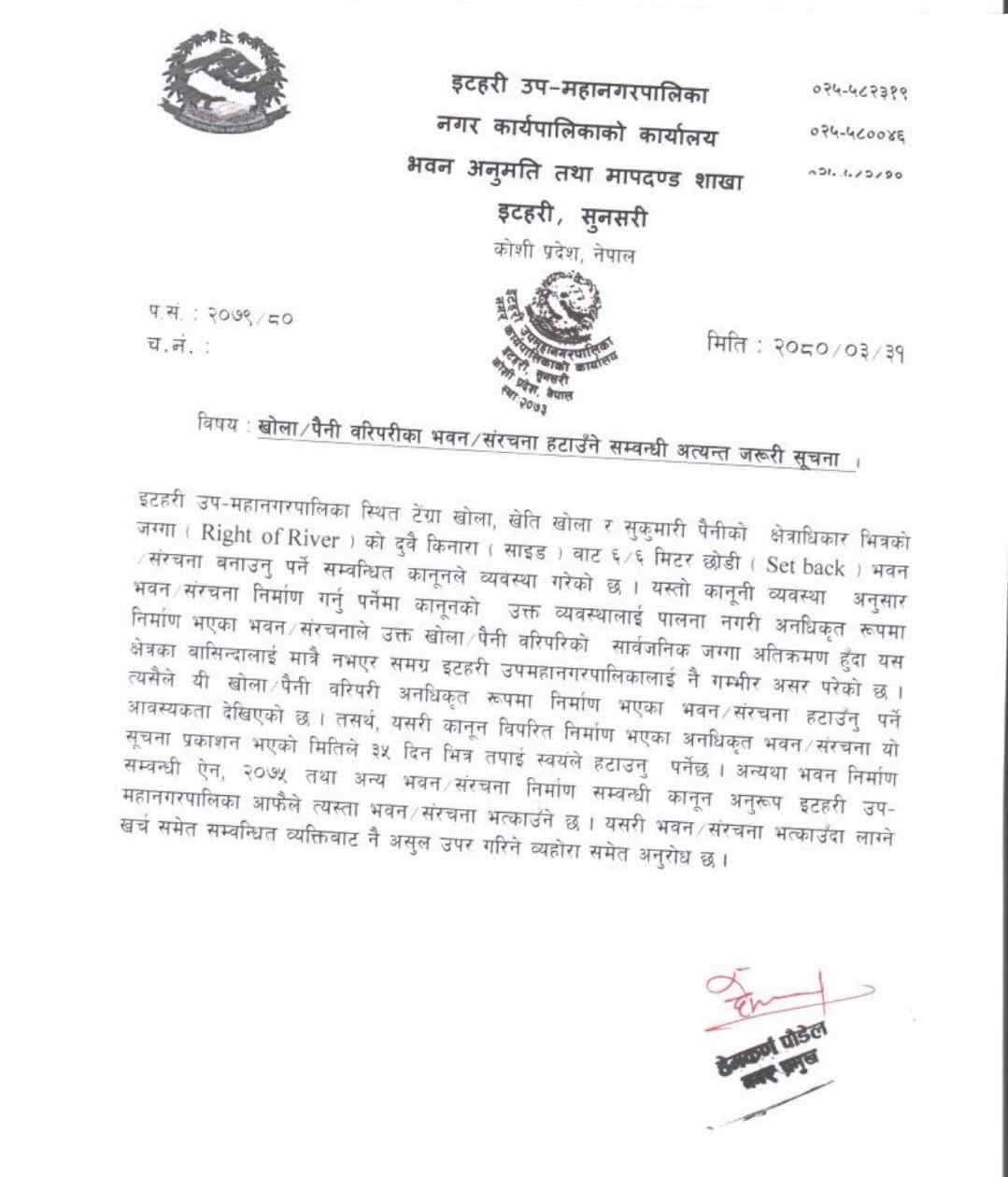 इटहरी । इटहरी उपमहानगरपालिकाले खोला, पैनी मिचेर बनाएको भौतिक संरचना भत्काउन सूचना जारी गरेको छ ।