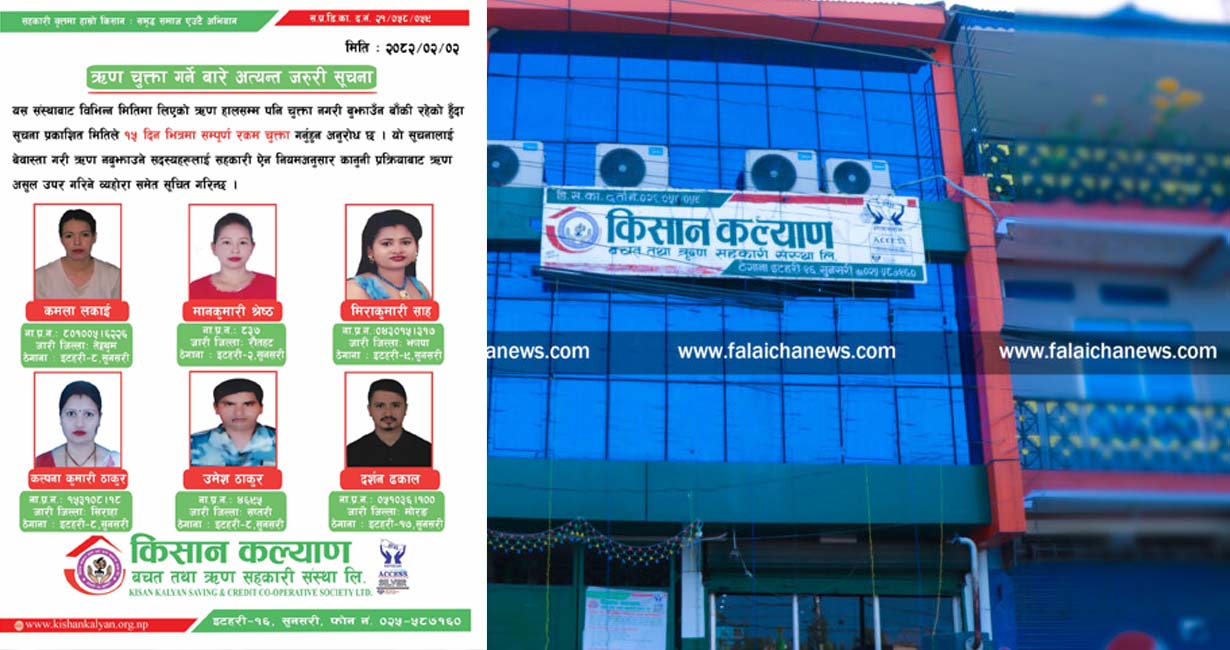 इटहरी । किसन कल्याण बचत तथा ऋण सहकारी संस्था लिमिटेड, इटहरी १६, सुनसरीले ऋण तिर्न बाँकी रहेका ६ जना सदस्यलाई १५ दिनभित्र सम्पूर्ण रकम चुक्ता गर्न आग्रह गरेको छ ।